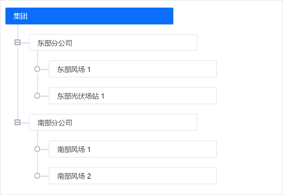 为组织结构节点关联资源后,节点即成为了资源在组织结构中的映射。例如组织结构中的“东部风场 1”节点即代表了现实中的“东部风场 1”场站。可在右侧节点详情面板中查看已关联的资源。