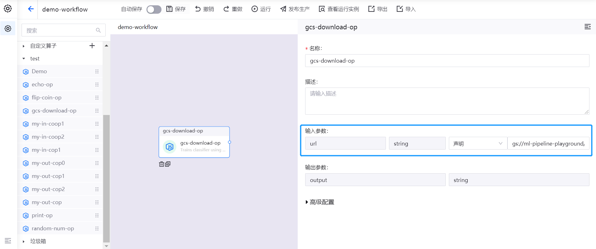 将 gcs-download-op 算子拖拽到编辑画布中,在其 输入参数 配置项中,使用 URL