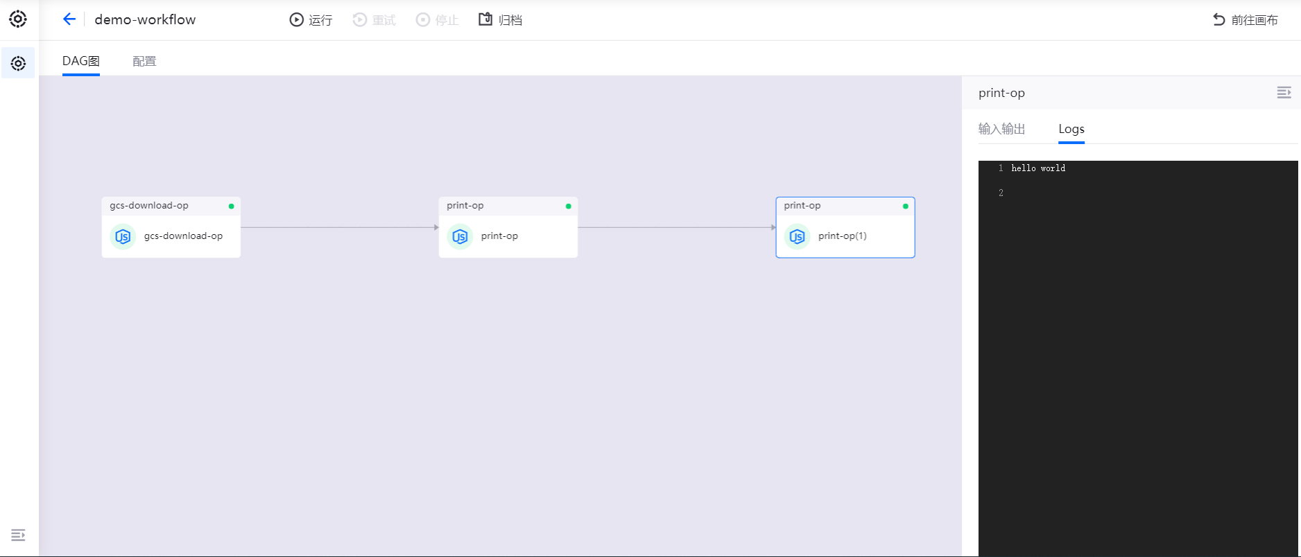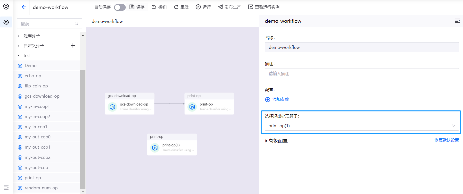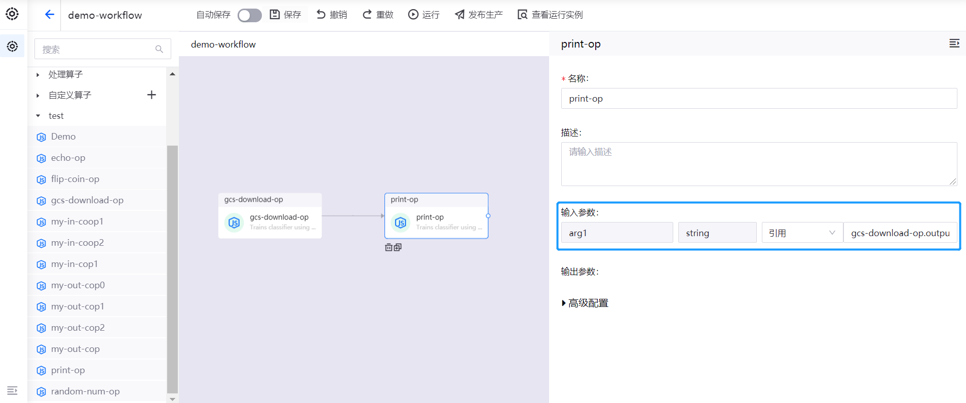 为 gcs-download-op 算子连接一个 print-op 算子,用于打印 gcs-download-op 算子的