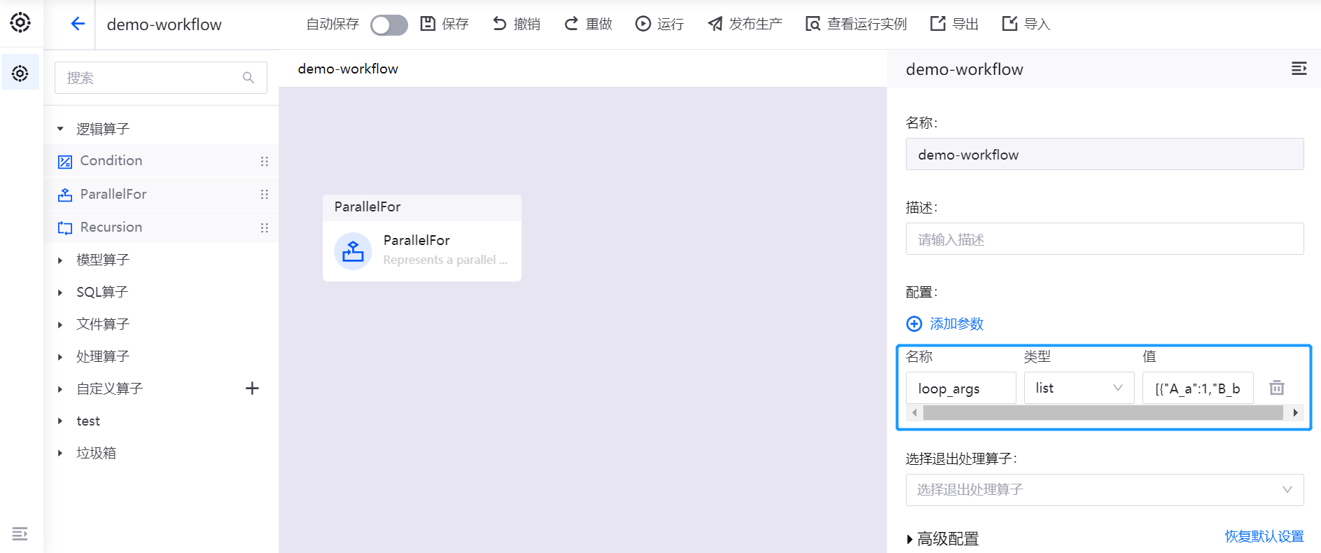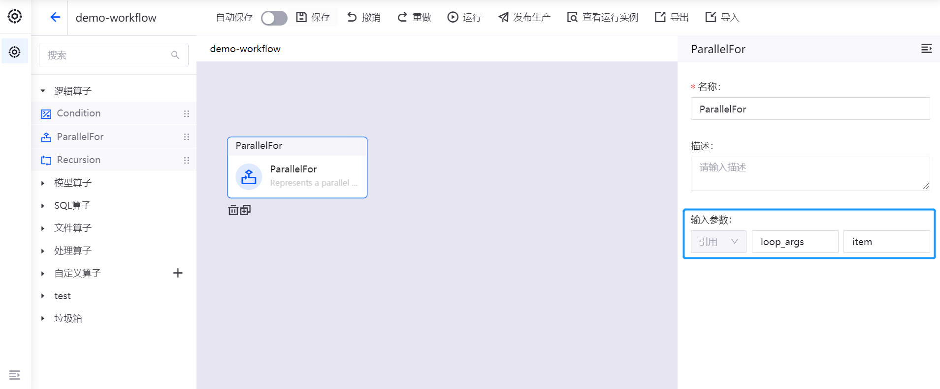选中 ParallelFor 算子,在其参数配置的 输入参数 项中,引用参数