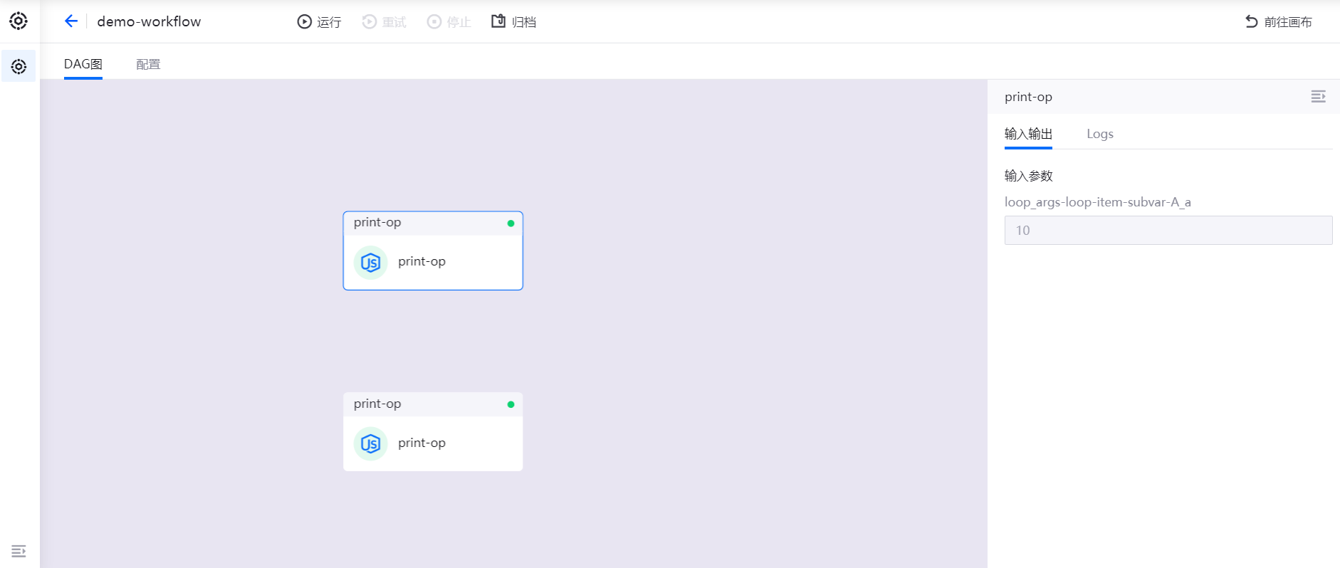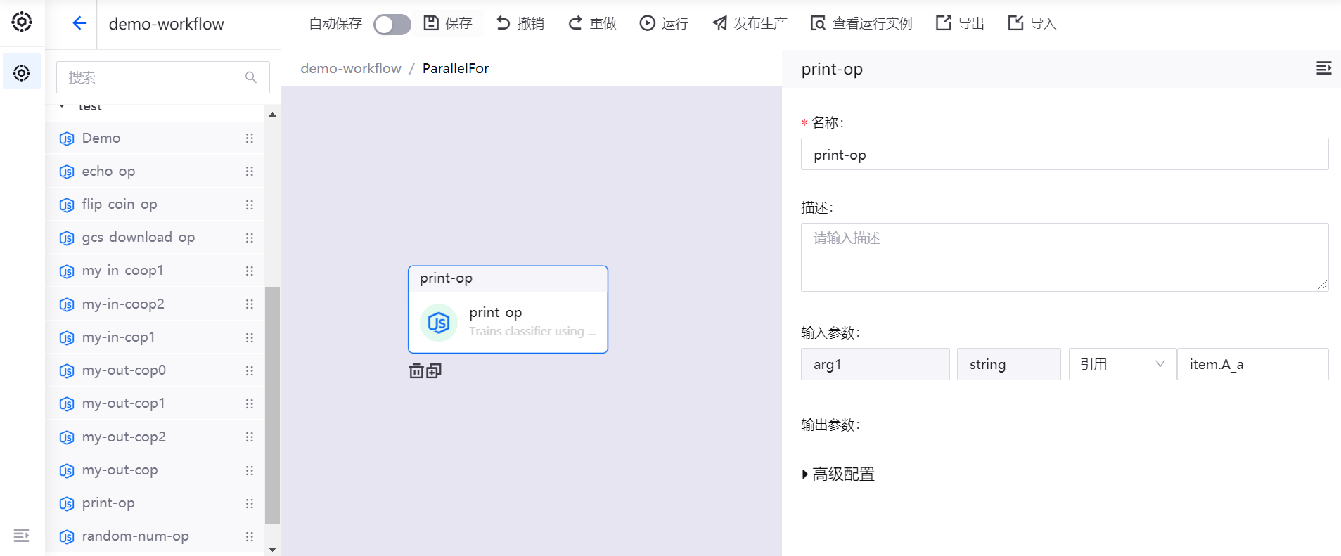 双击 ParallelFor 算子,打开其子画布,将 print-op 算子拖拽到编辑画布中,用于输出