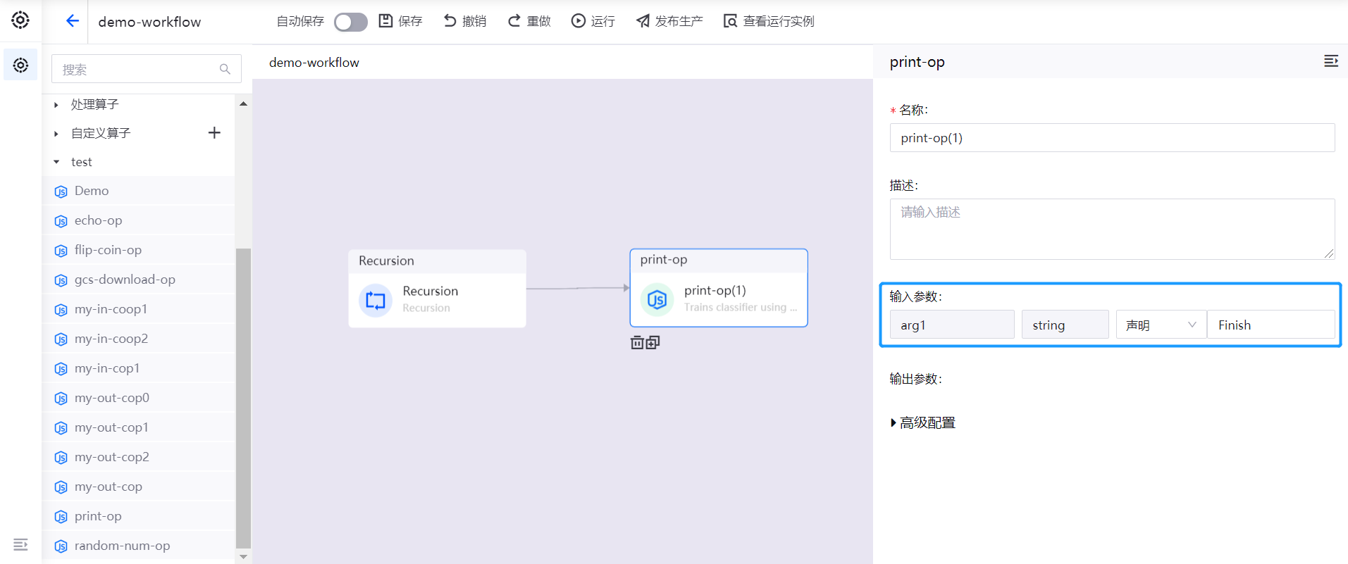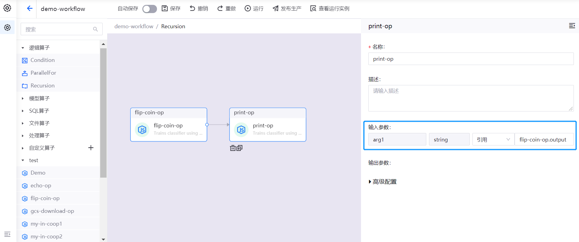 选中 Recursion 算子,引用子画布中 flip-coin-op 算子的