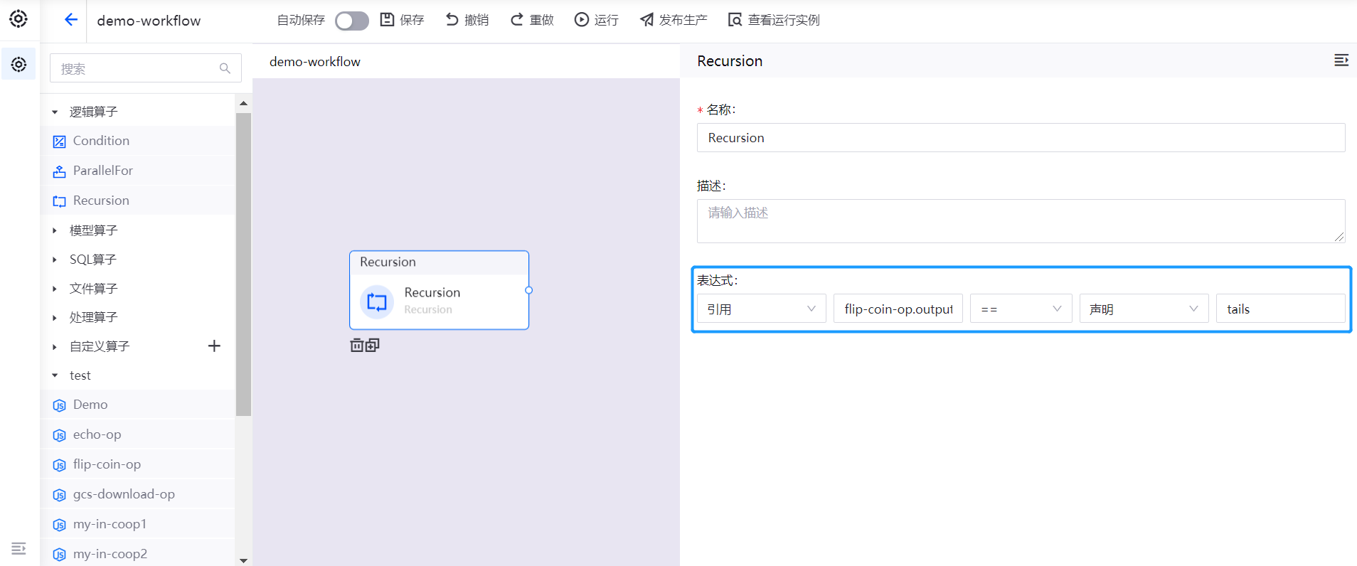 本章节以 “抛硬币” 场景为例(如果是硬币正面则一直抛硬币,直到出现硬币反面则退出),介绍 Recursion 算子的配置和使用说明: