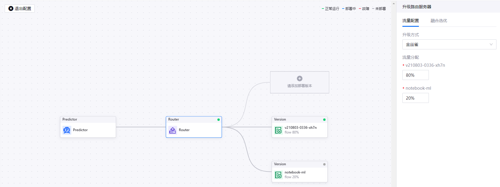 在 模型部署 画布栏中,选中 Router 卡片,然后在右侧的 升级路由服务器 > 流量配置 窗口中,选择 金丝雀 升级方式,并为模型版本分配流量占比。