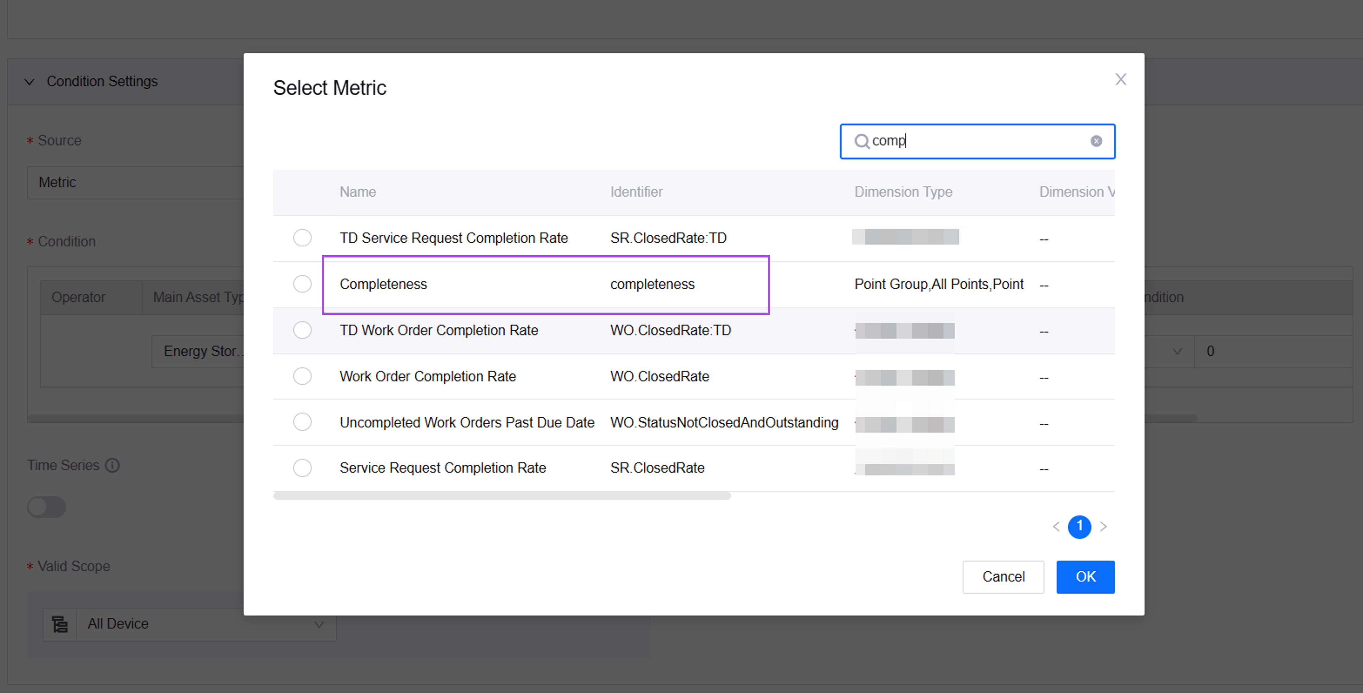 For example, if you select the “Completeness” metric, choose “Measurement Point” for the dimension type, and select “Active Alarms” as the dimension value, it means that when the completeness of “Active Alarms” measurement point data in the model meets the condition, an alarm will be triggered.