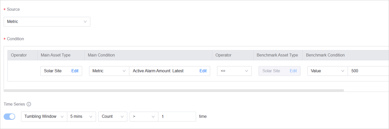 Cumulative Metric: A sub-metric of a primary metric, such as “Daily Power Generation”. When used as an alarm condition, it already has a default time range. For example, “Today” means the range is data from today, and “Latest” means the range is only the most recent value at the current moment. If left empty, the time range is unrestricted.