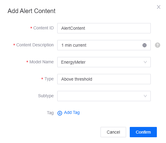 Content Description: Enter the description of the alert content, which may include the possible causes and solutions for the alert. The input supports internationalization, and can be text or a measurement point variable, using its identifier, to return its value.