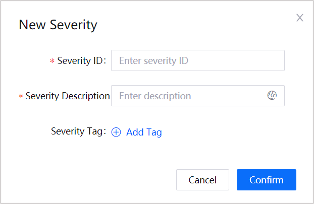Click New Severity and enter the following information in the pop-up:provide an ID, description, and tag (optional) for the alert severity.