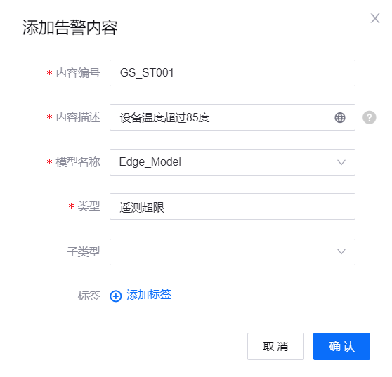 点击 新增内容,在弹窗中输入内容编号、内容描述,选择告警内容适用的设备类型和告警类型,定义内容标签。如下图所示。