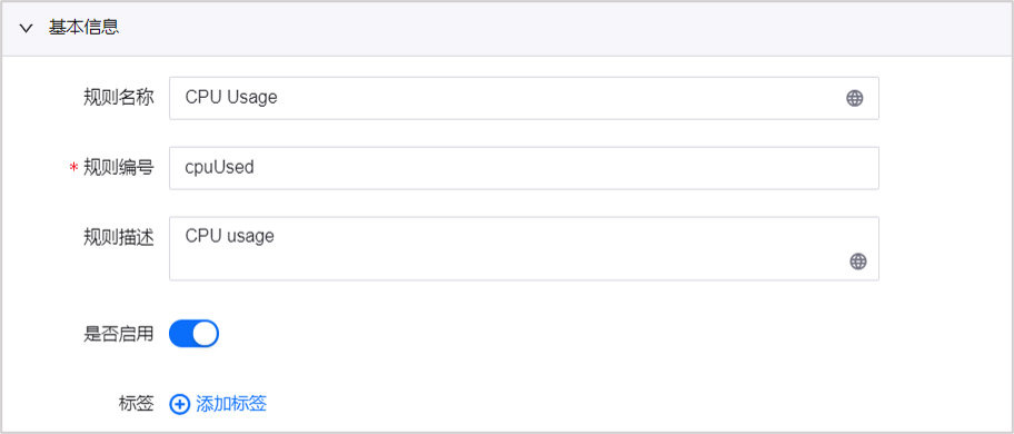 在 基本信息 中填写告警规则的基本信息,例如其编号,描述等。