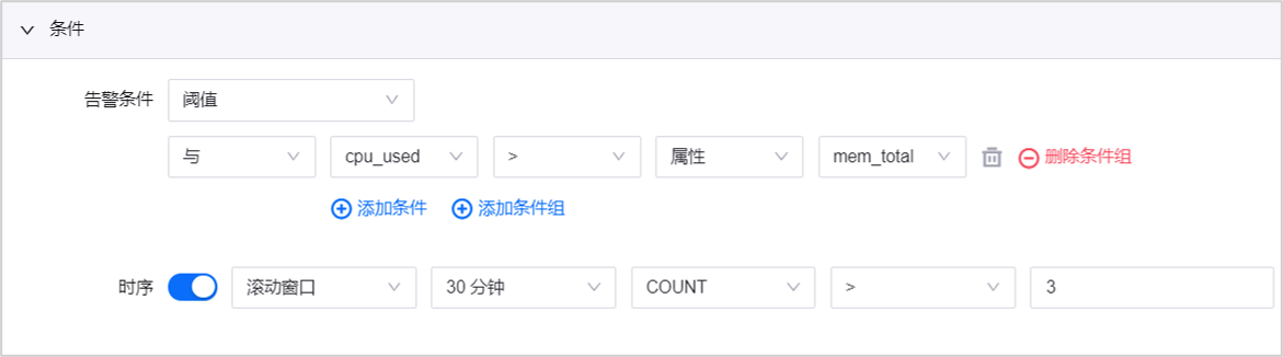 增加基于滚动窗口或滑动窗口的时序条件作为告警触发条件。 |
