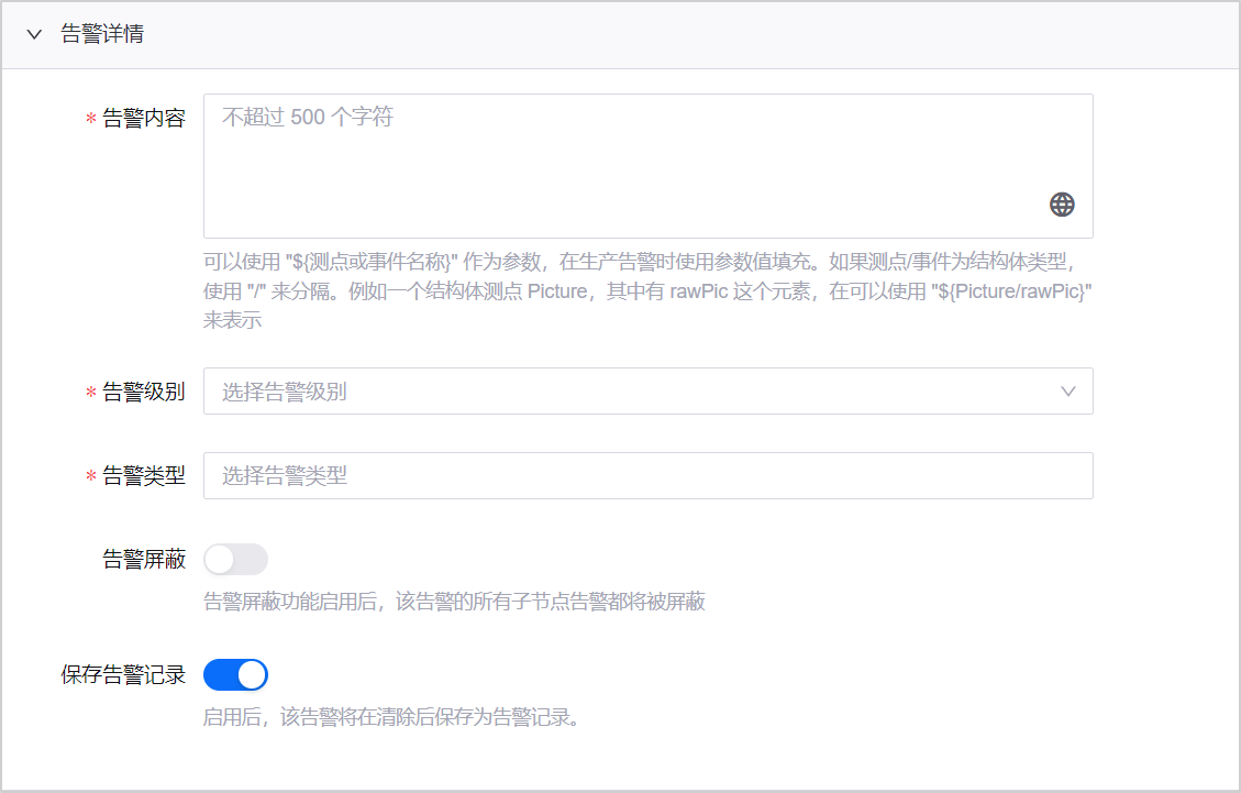 告警详情 部分可以设置更多信息,例如告警内容、级别、类型等。