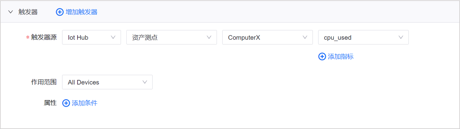 告警条件:当 触发器源 为 设备连接与管理 > 资产测点/资产事件 或 其他 > 告警源 > 指标 时,选择并设置条件触发告警。