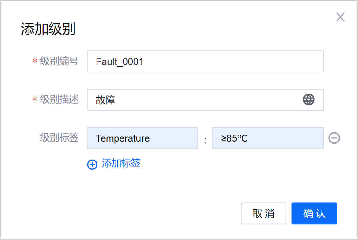 若温度超过 85℃ 时,设备存在重大安全风险,可为这一状态设置“故障”这一告警级别。