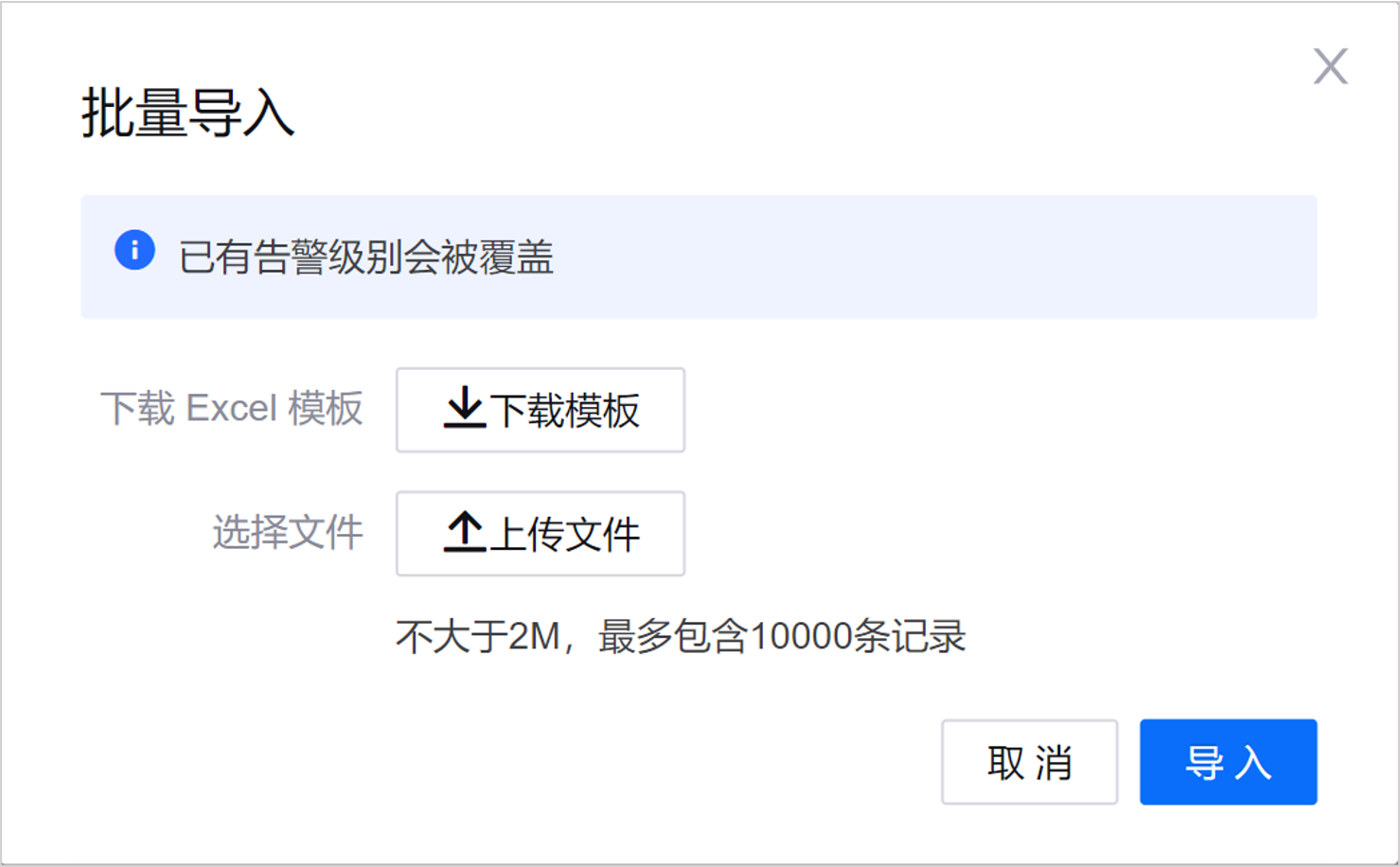 由于级别编号在同一个 OU 内唯一不可重复,当导入的告警级别与页面已有的告警级别的级别编号重复时,已有的告警级别将被覆盖,更新为最新导入的内容。当导入的告警级别与通过 Open API 接口创建的告警级别的级别编号重复时,导入无效,通过 Open API 接口创建的告警级别不会被覆盖。