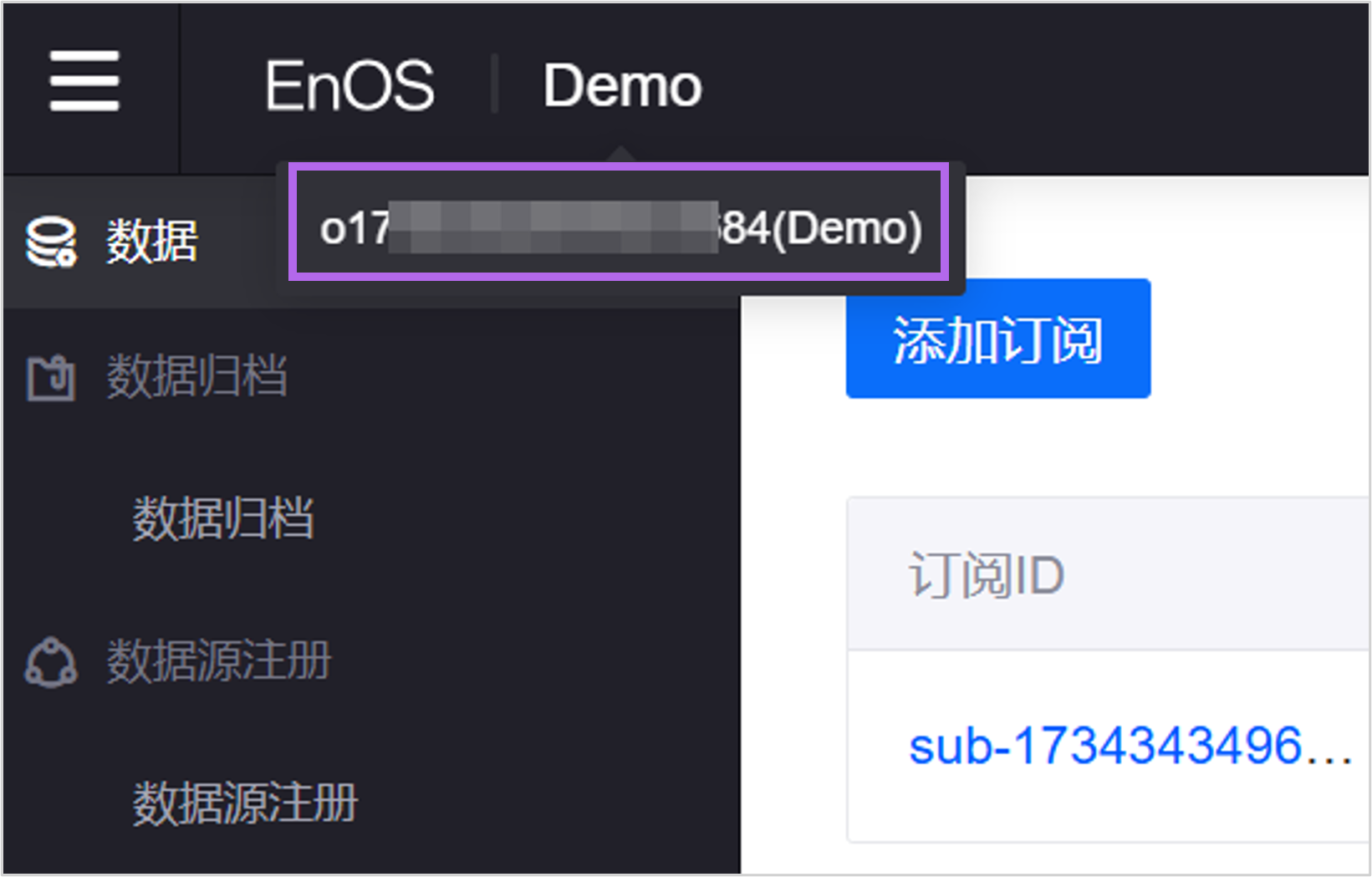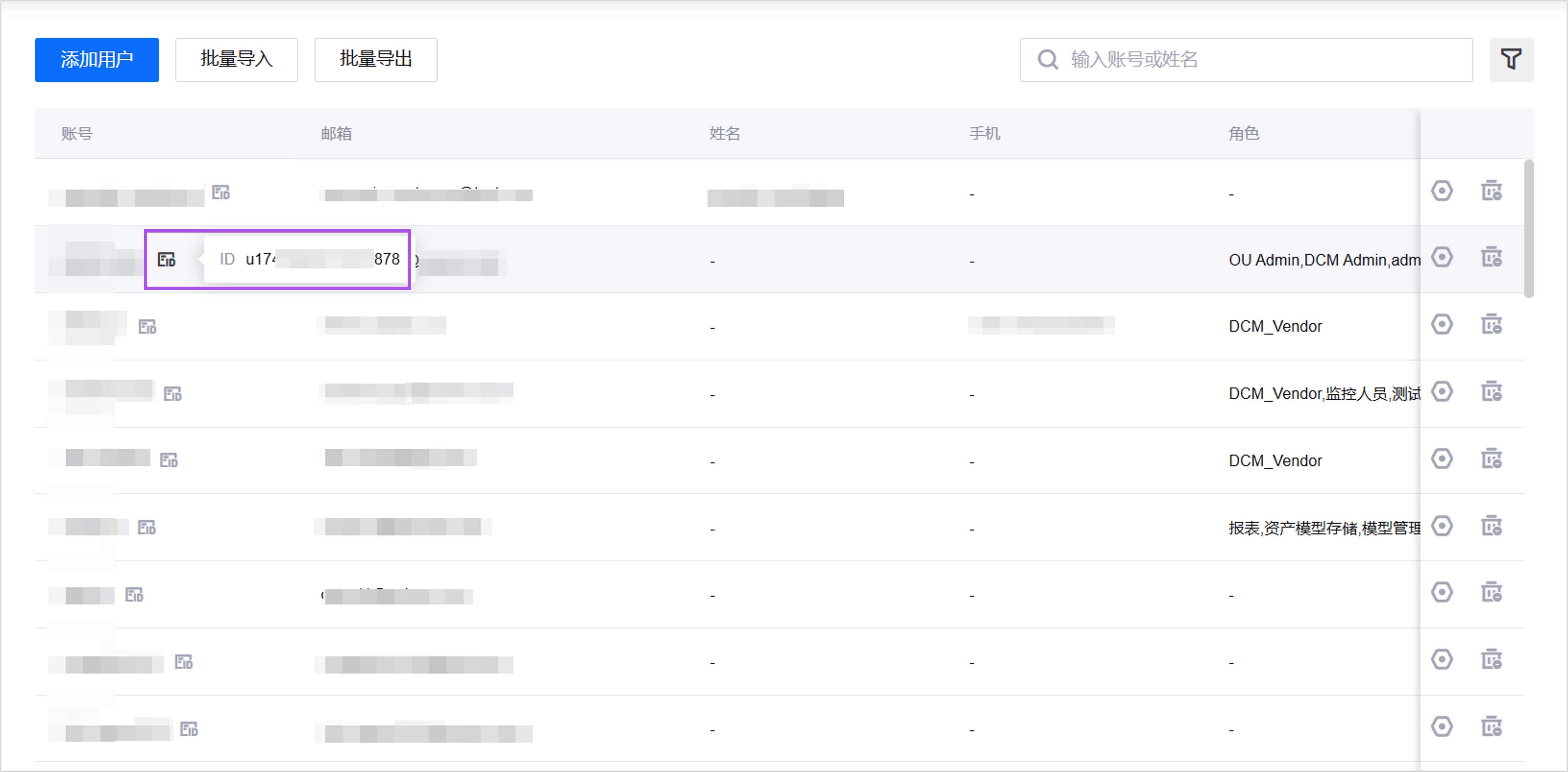 在 EnOS 应用门户 > 管理员控制台 左侧导航栏进入 用户 菜单,在用户列表中将鼠标悬浮在账号名称旁,查看用户 ID。