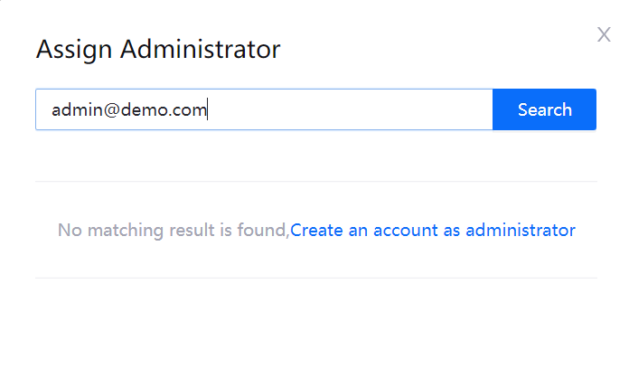 Enter an email address to find an existing user and assign the user as the OU administrator. If the user does not exist, click Create an account as administrator.