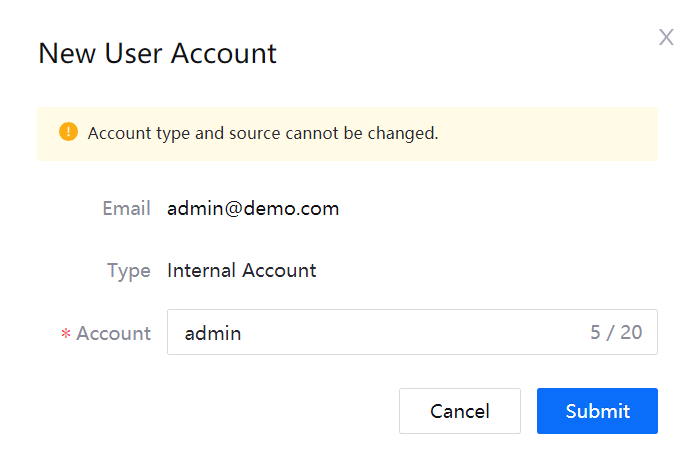 In the New User Account pop-up window, change the OU administrator’s account name and click Submit.