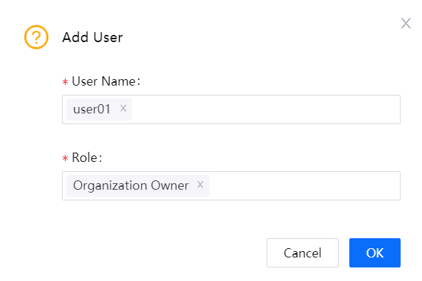 Select one or multiple users to add as organization members, select their roles in the organization, and click OK.