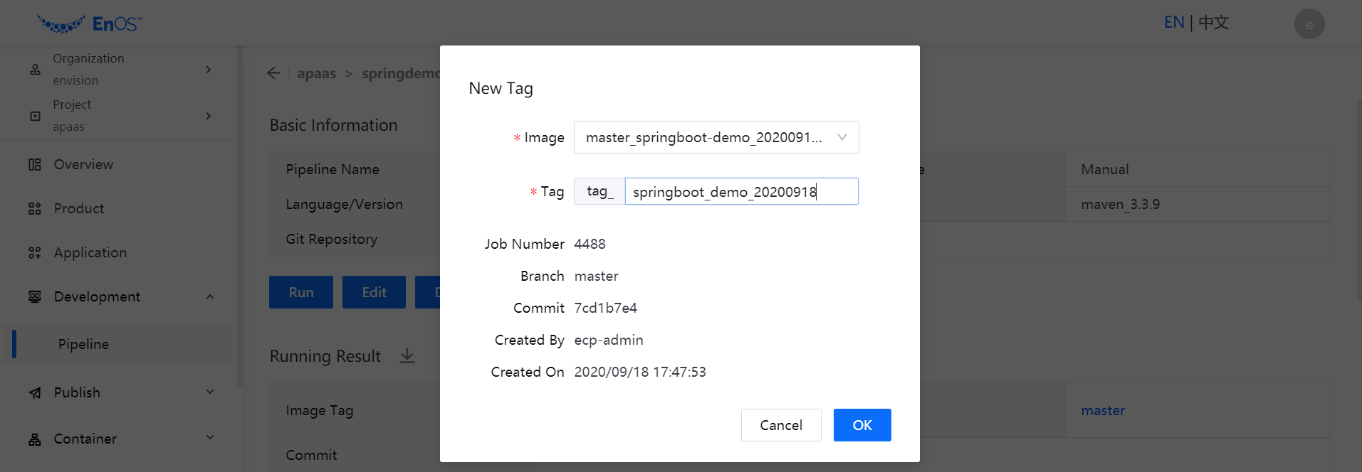 After the pipeline build job runs successfully, the Project QA or Application QA role can create a tag (for production environment synchronization) for the built image of the application. The tag created for the image will be synchronized to the application’s Git repository. With the created tag, the application image can be synchronized to the production environment.