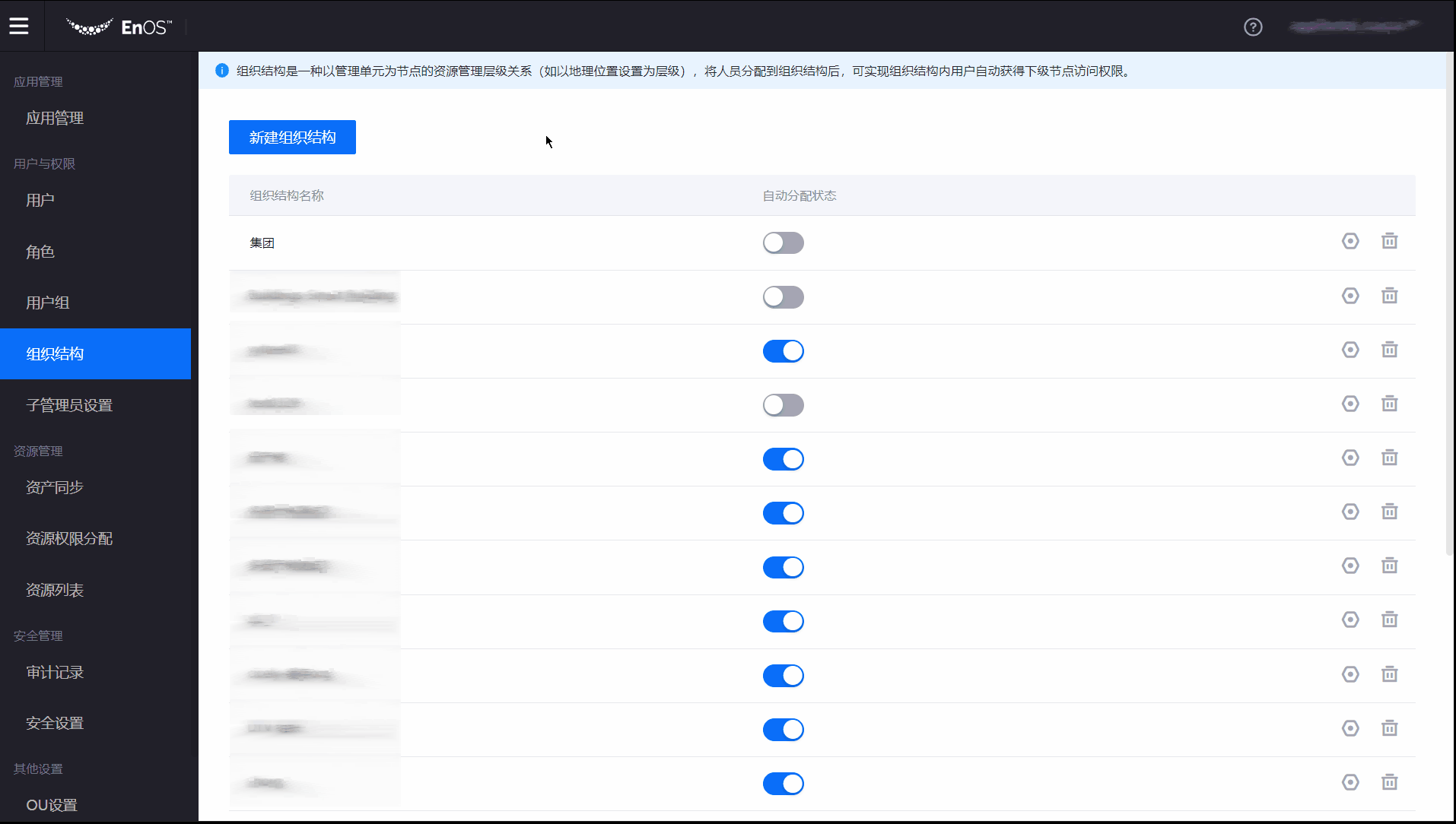 在组织列表中,开启 集团 组织结构的 自动分配状态 开关,此组织结构各节点上的用户将自动获得下级节点中的资源访问权限。