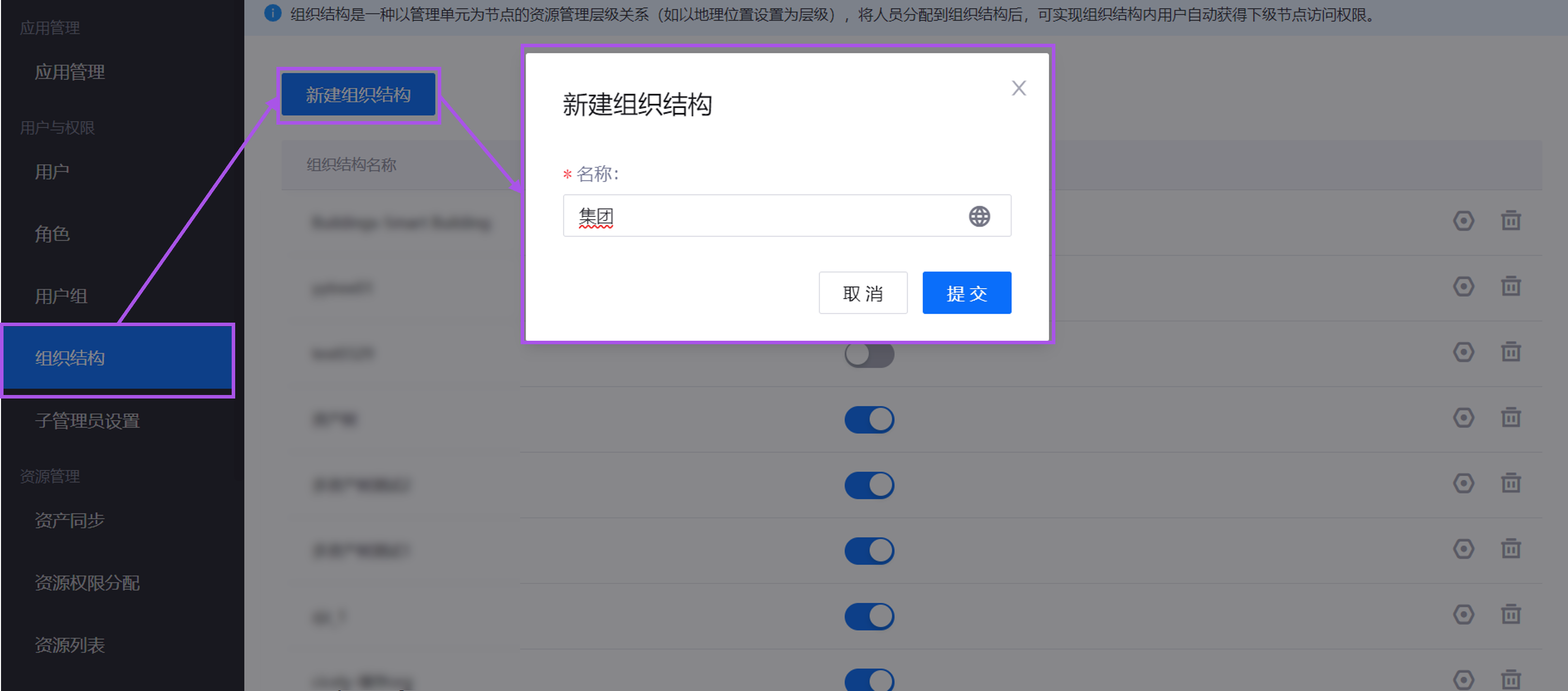 选择 新建组织结构,在弹窗中输入新组织结构的名称(例如