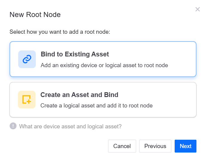 Bind to Existing Asset: Select and bind an existing asset to the root node. The asset list displays the assets under the current OU. Choose a device asset or logical asset, then click OK.