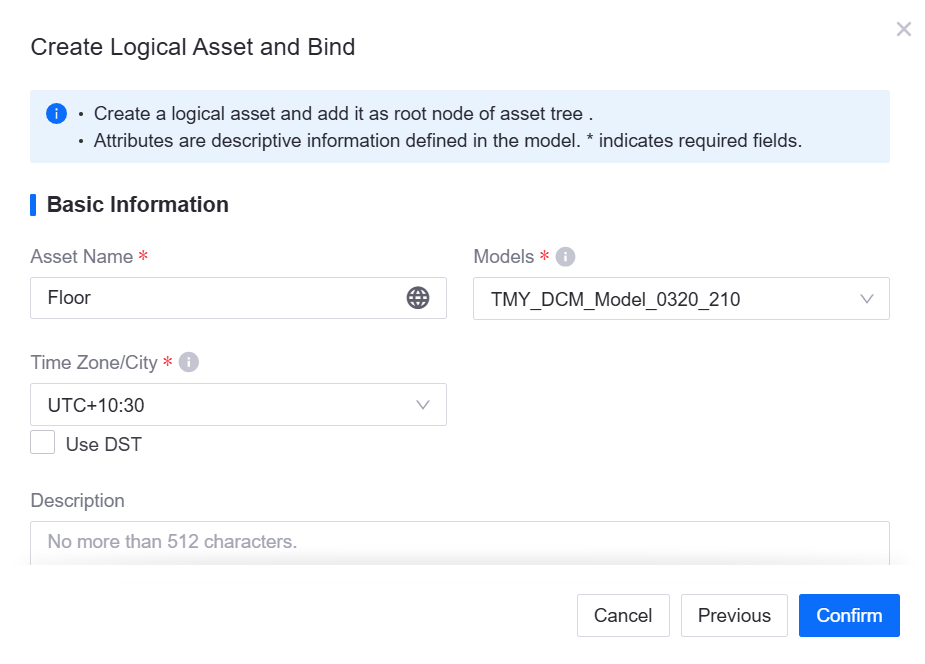 Fill in the name, model, and time zone of the logical asset. If the model specifies attributes, you also need to provide the corresponding values. Once the sub-node is successfully added, the created logical asset can be viewed in the Device Management > Logical Assets list.