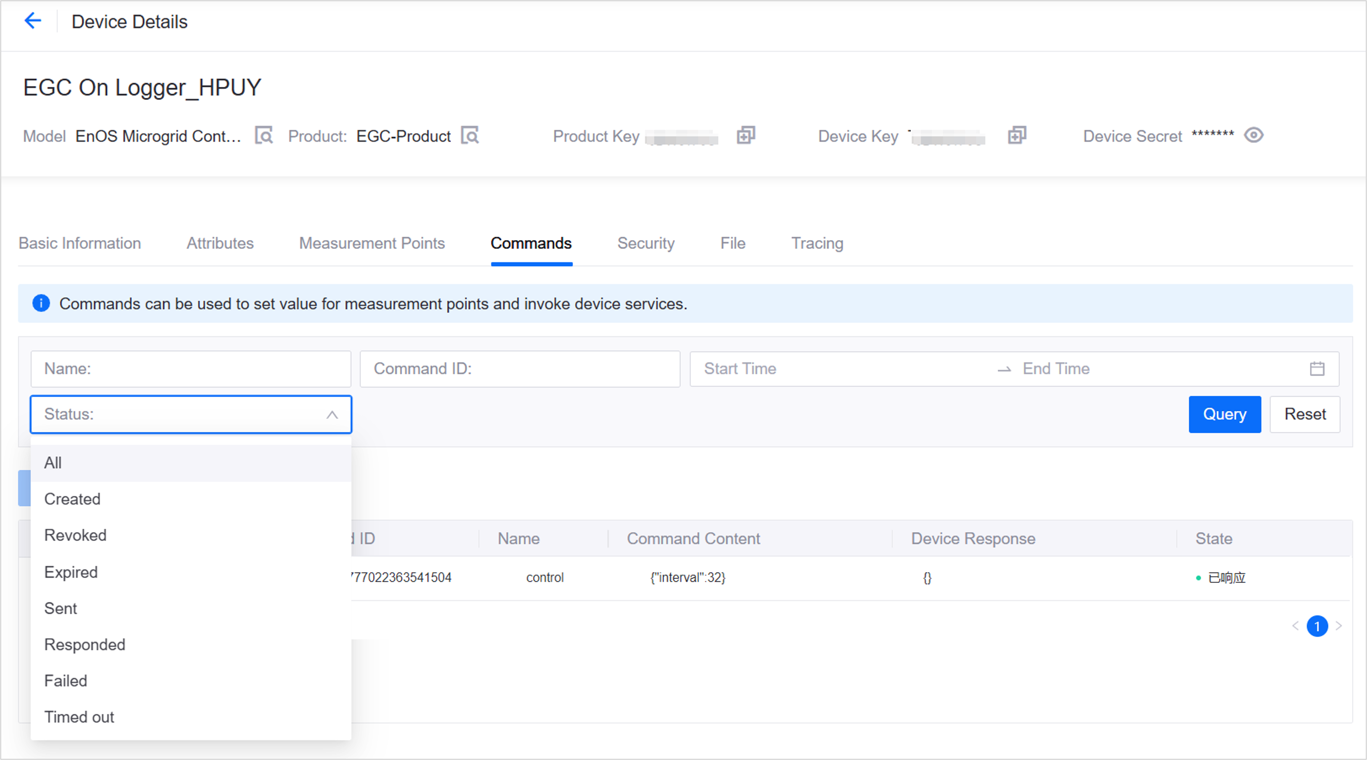 .On the Device Details page, click the Commands tab to query command information and status. Commands can have the following statuses: