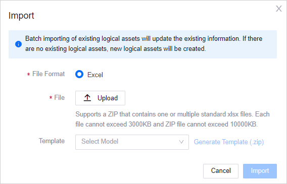 Upload a ZIP File that contains one or multiple logical asset .xlsx files. For file size limitations, refer to the pop-up window.