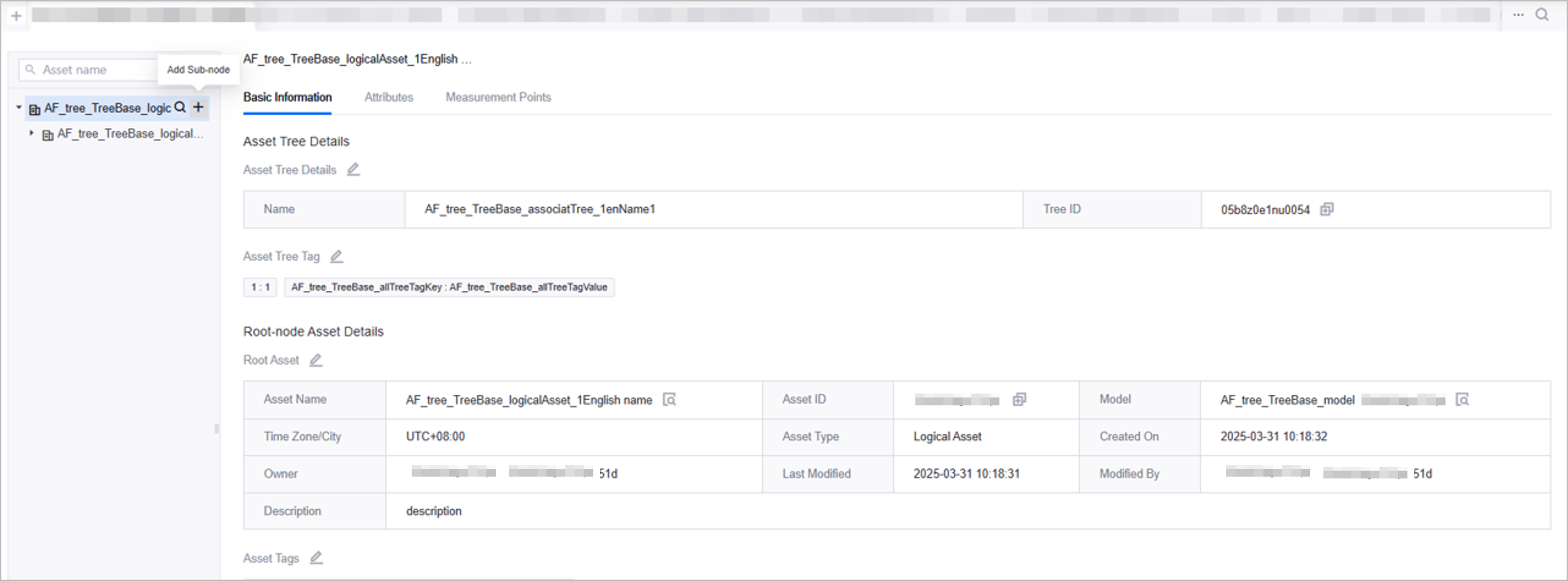 Select a node in the asset tree to serve as the parent node for your logical asset. Click + Add Sub-node for that node.