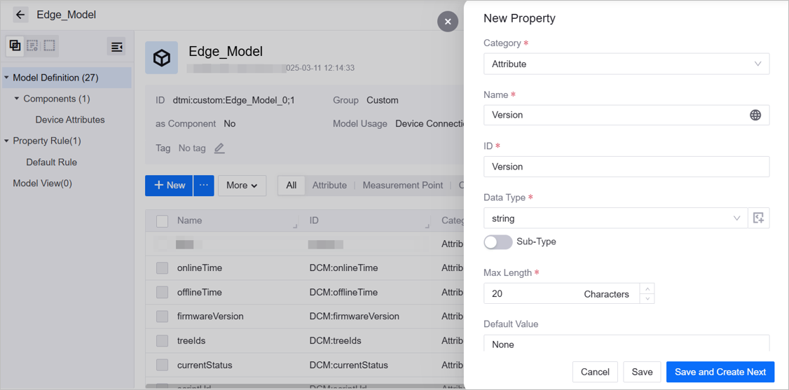 On the model details page, create the following attribute by referring to Creating Model Elements: