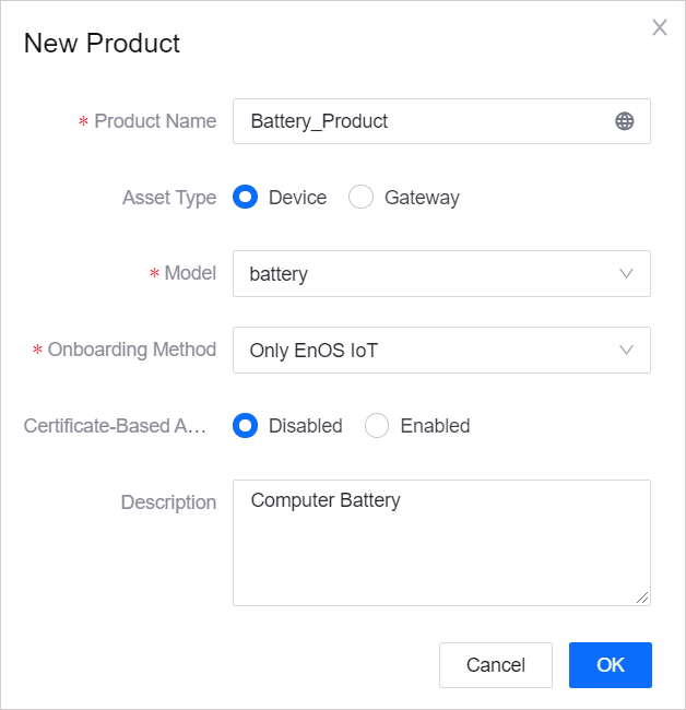 In this step, create a product called Battery_Product. It is assumed that a device of this product model sends data in JSON format and that the data transmission is not encrypted using the CA certificate.