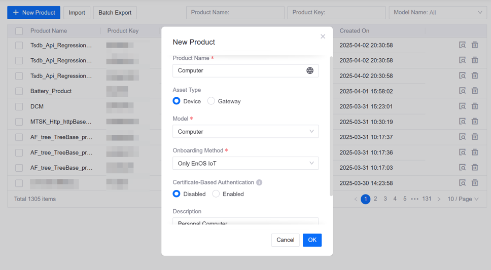 In EnOS Application Portal > Developer Console, select Device Management > Device Assets.