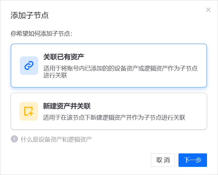 关联已有资产:从现有资产中选择并绑定至根节点。在资产列表中,列举了当前 OU 下的资产。选择一个设备资产或逻辑资产,然后点击 确认。