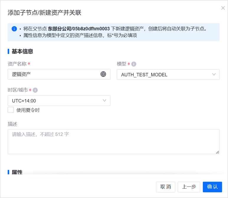 新建资产并关联:新建逻辑资产并绑定至根节点。在页面中填写逻辑资产的基本信息。如果模型中规定了属性,还需要填写相应的值。一旦资产树创建成功,创建的逻辑资产可在 设备管理 > 逻辑资产 列表中查看。