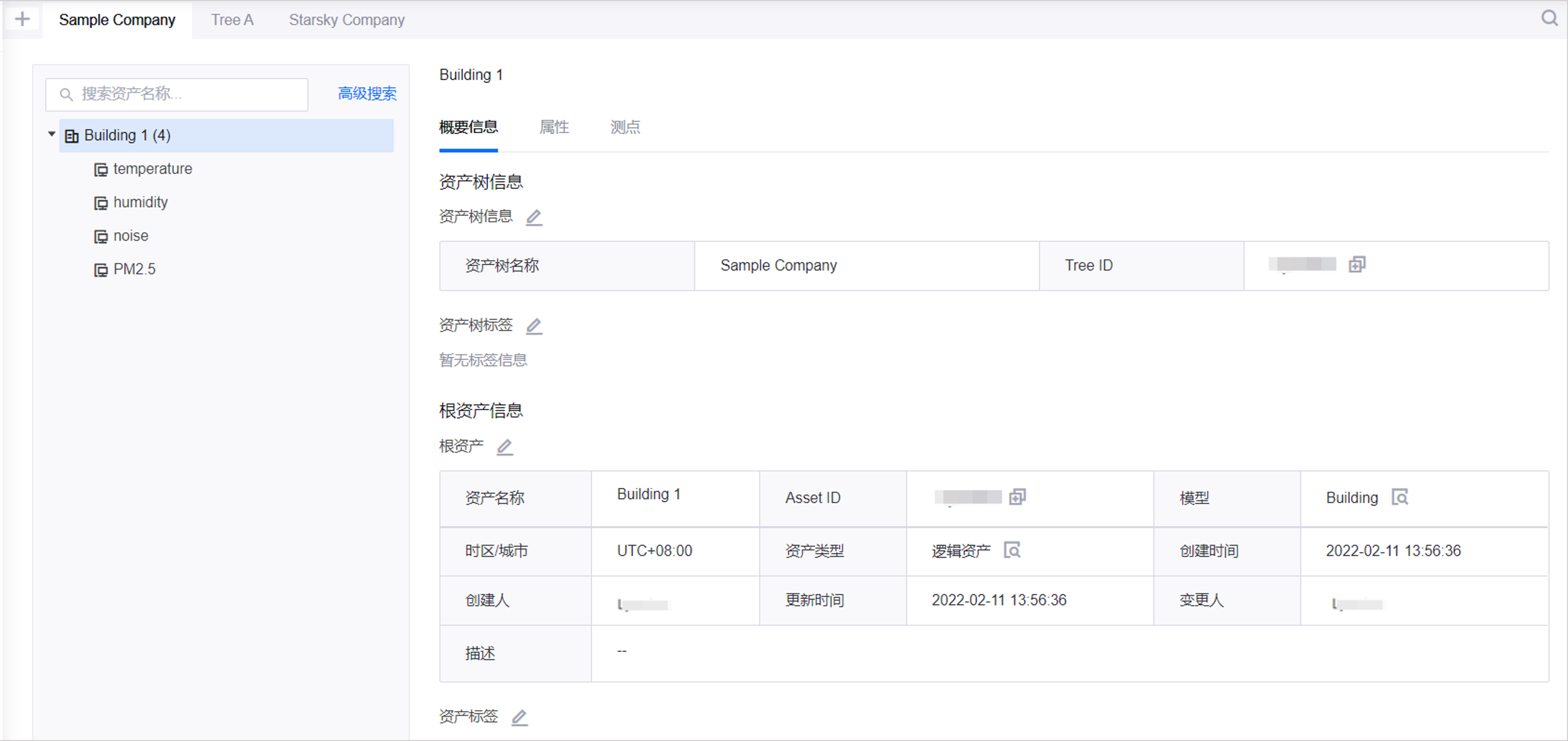 在应用门户的管理控制台,选择 资产树 菜单。在页面左上角点击 +,创建一棵名为 “Sample Company” 的资产树。
