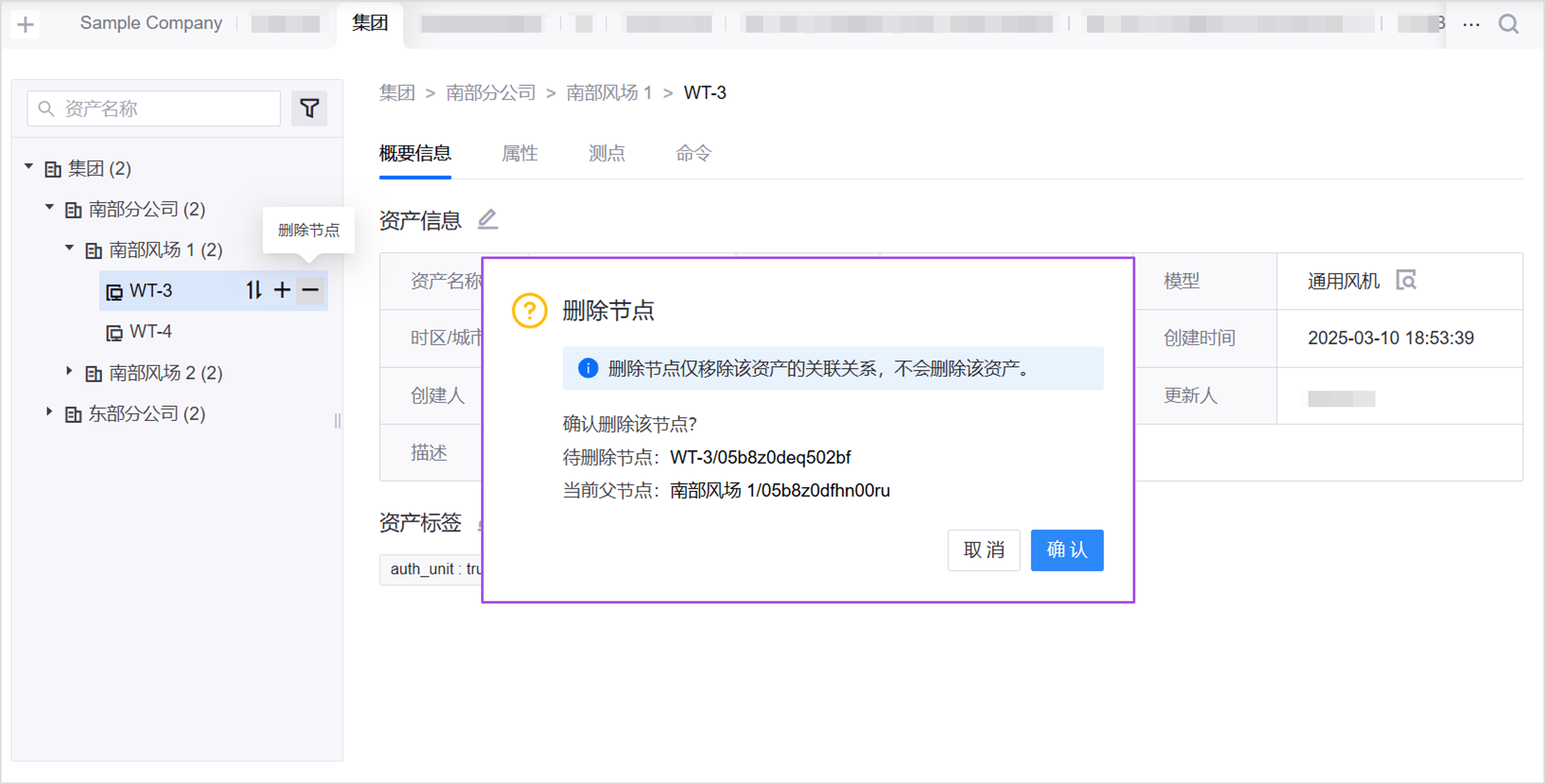 删除子节点,仅删除资产树与资产的关联关系,不会删除 设备管理 > 设备资产 或 设备管理 > 逻辑资产 中已存在的资产。不支持删除根节点。