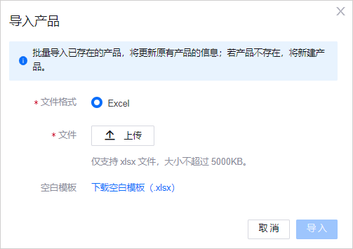 该功能能使用 Excel 文件批量创建新产品或批量更新不同模型的现有产品。批量导入已存在的产品将更新原有产品的信息。若产品不存在,将新建产品。