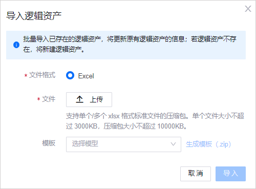 上传包含一个或多个逻辑资产 .xlsx 文件的压缩包。若需要模板,从 模板 下拉框选择一个或多个当前模型,然后点击 生成模板 以下载一个压缩包,其中包含基于所选模型而生成的 Excel 模板。下载后请编辑模板,压缩并上传文件。表格中请勿出现空行,否则可能导致文件无法导入成功。