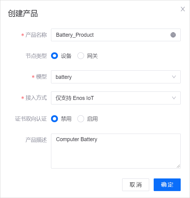 在此步骤中,你需要创建一个名为 Battery_Product 的产品。假设此产品型号的设备以 EnOS IoT 标准格式发送数据,并且未使用 CA 证书对数据传输进行加密。
