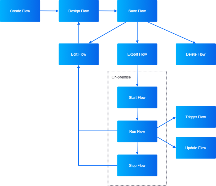 An integration flow is a flow that you can design and build to deploy business processes as a series of steps via the Flow Designer in EnOS Application Portal > Developer Console. Each integration flow can only have one flow input node to start the flow.