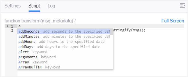 The JavaScript (ES5.1 supported) for converting the input into the desired format. The supported function is transform with two parameters, msg and metadata. The msg is the input message, and the metadata can be the MQTT topic for example, which can be used in the script.