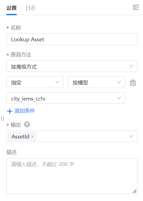 将 Lookup Asset 节点添加到画布,并按照以下说明配置节点。有关 Lookup Asset 节点的更多信息,参见 Lookup Asset。