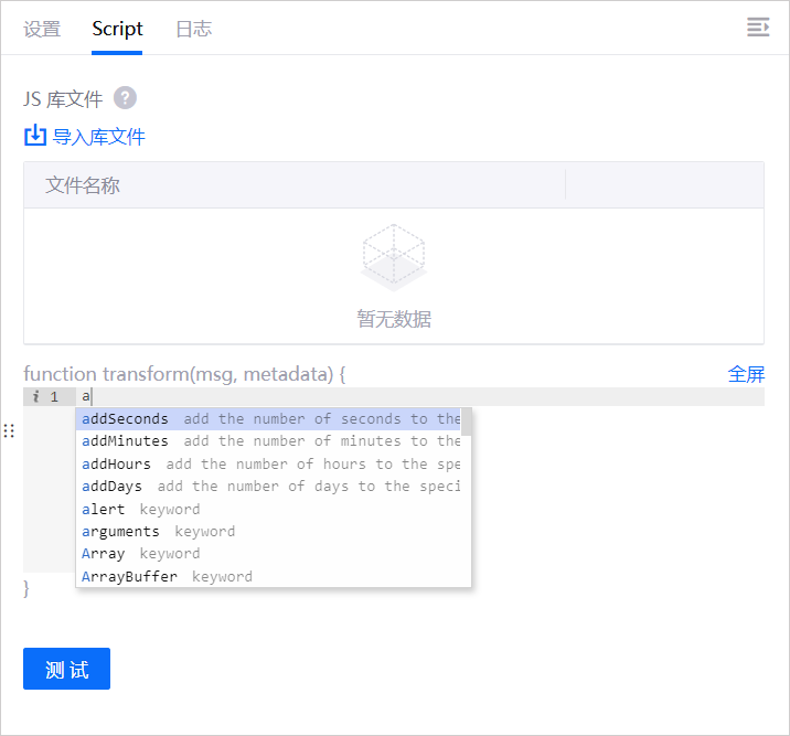用于导入第三方 JS 库代码文件,同时在下方输入框內调用文件中的函数,实现自定义的功能。导入文件后,选择 启用
