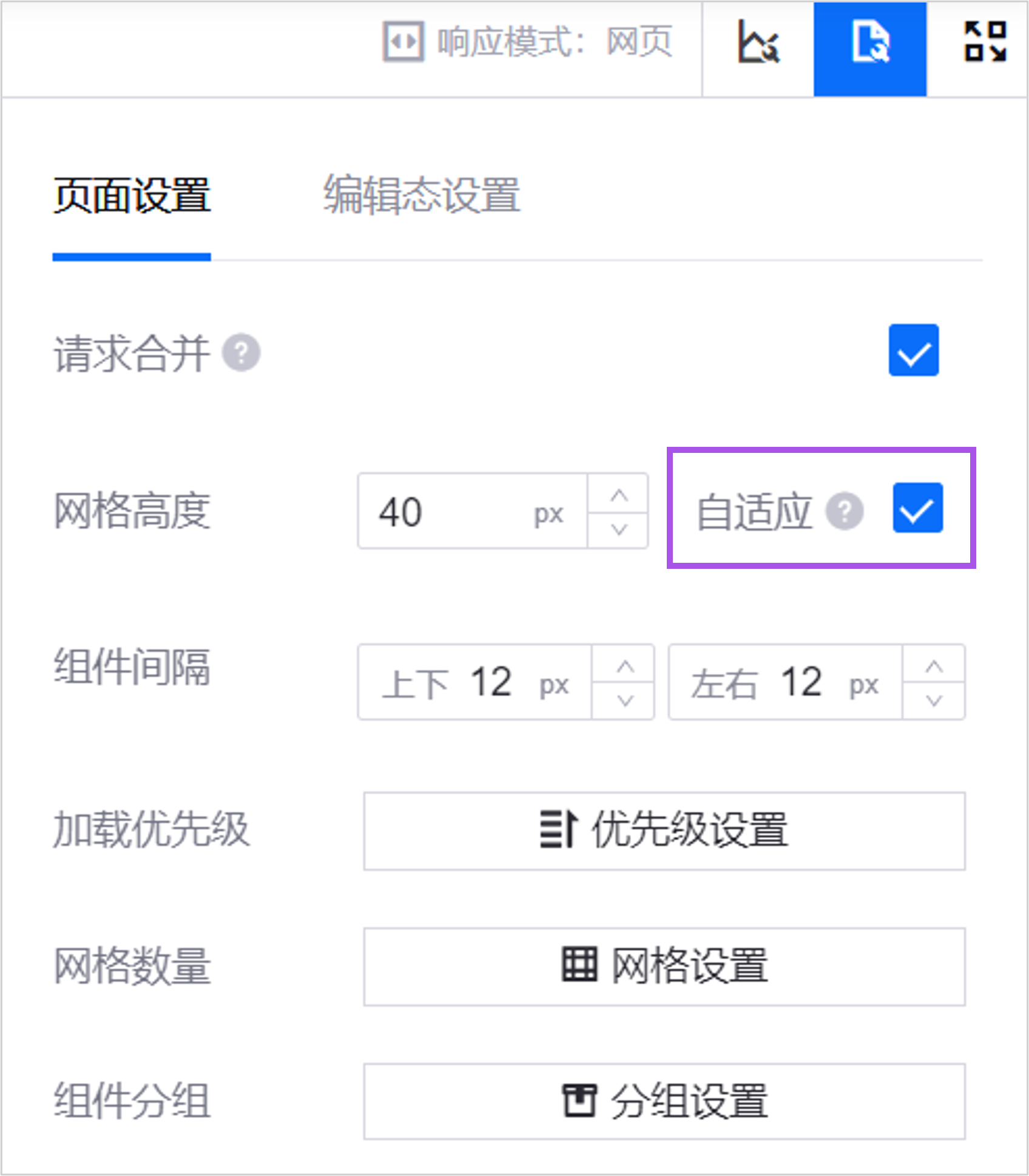当你需要在多种不同尺寸的屏幕中展示页面时,可勾选 网格高度自适应。页面将根据展示屏幕的高度,面板的宽度以及页面网格数量,自动计算需要的网格高度,并使用到页面展示过程中。