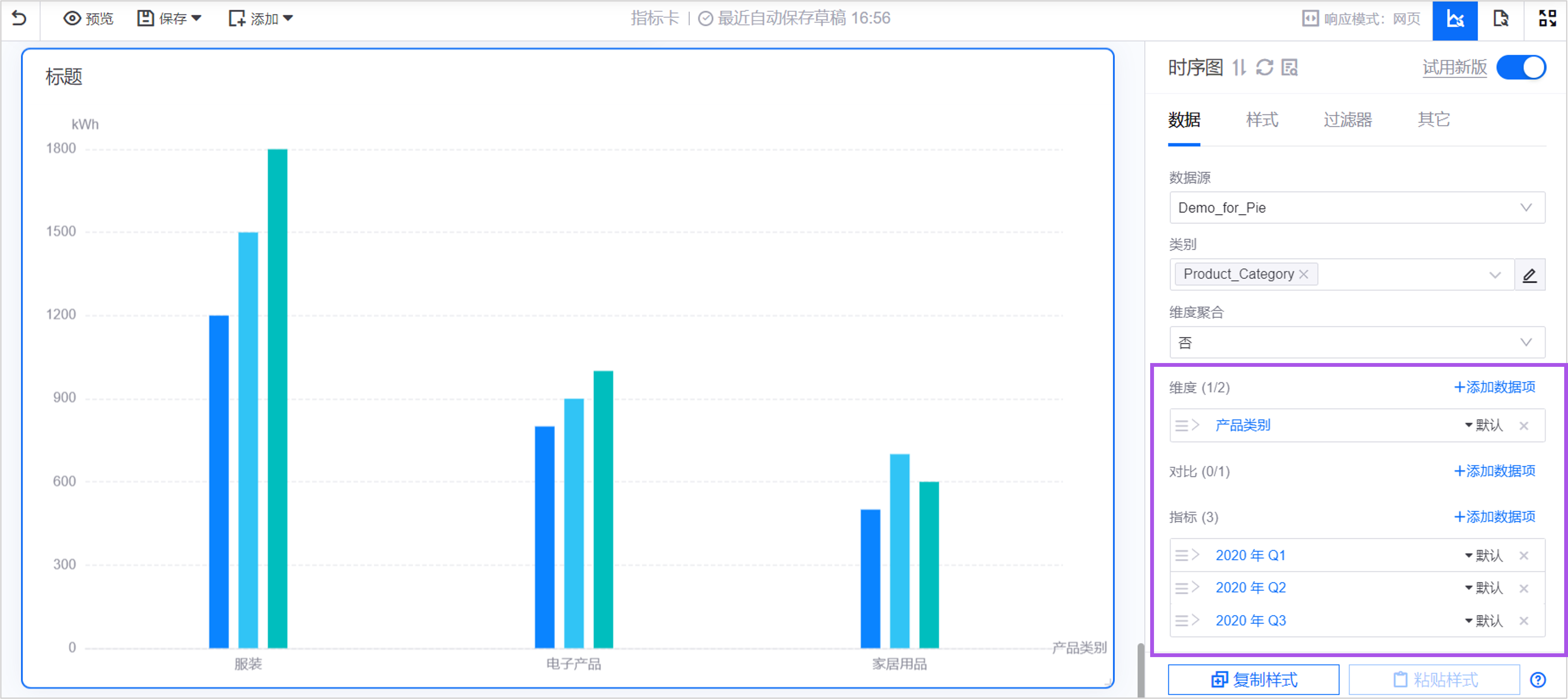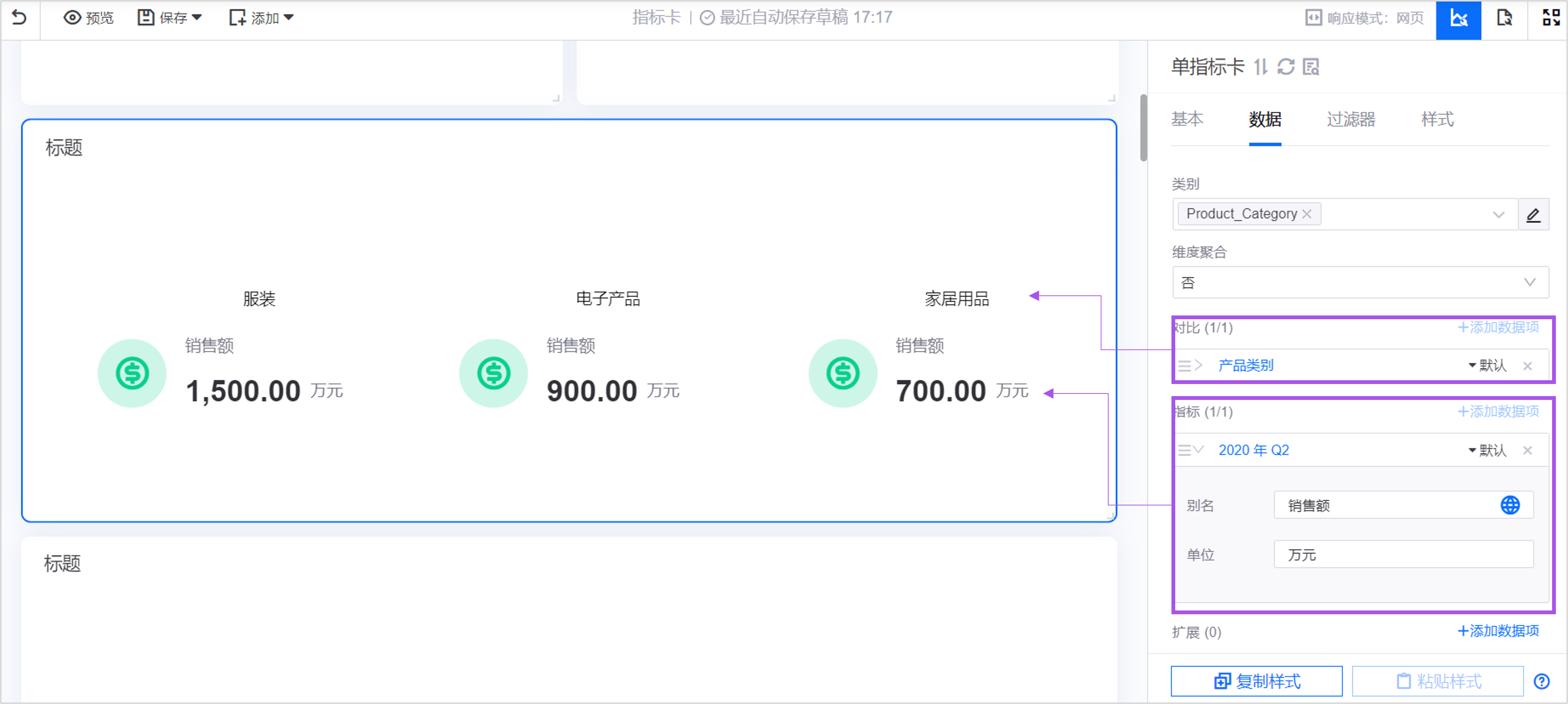 在上述数据中,以 产品类别 为对比项,在 单指标卡 组件中可生成多个指标数据,分别展示每一类别下的产品销售额。