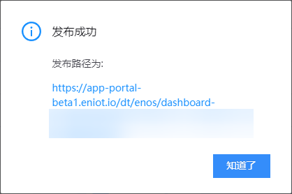 2. 等待片刻后,系统会跳出显示发布成功的对话框窗口。复制发布页面的 URL,该 URL 可将页面集成到应用中使用。
