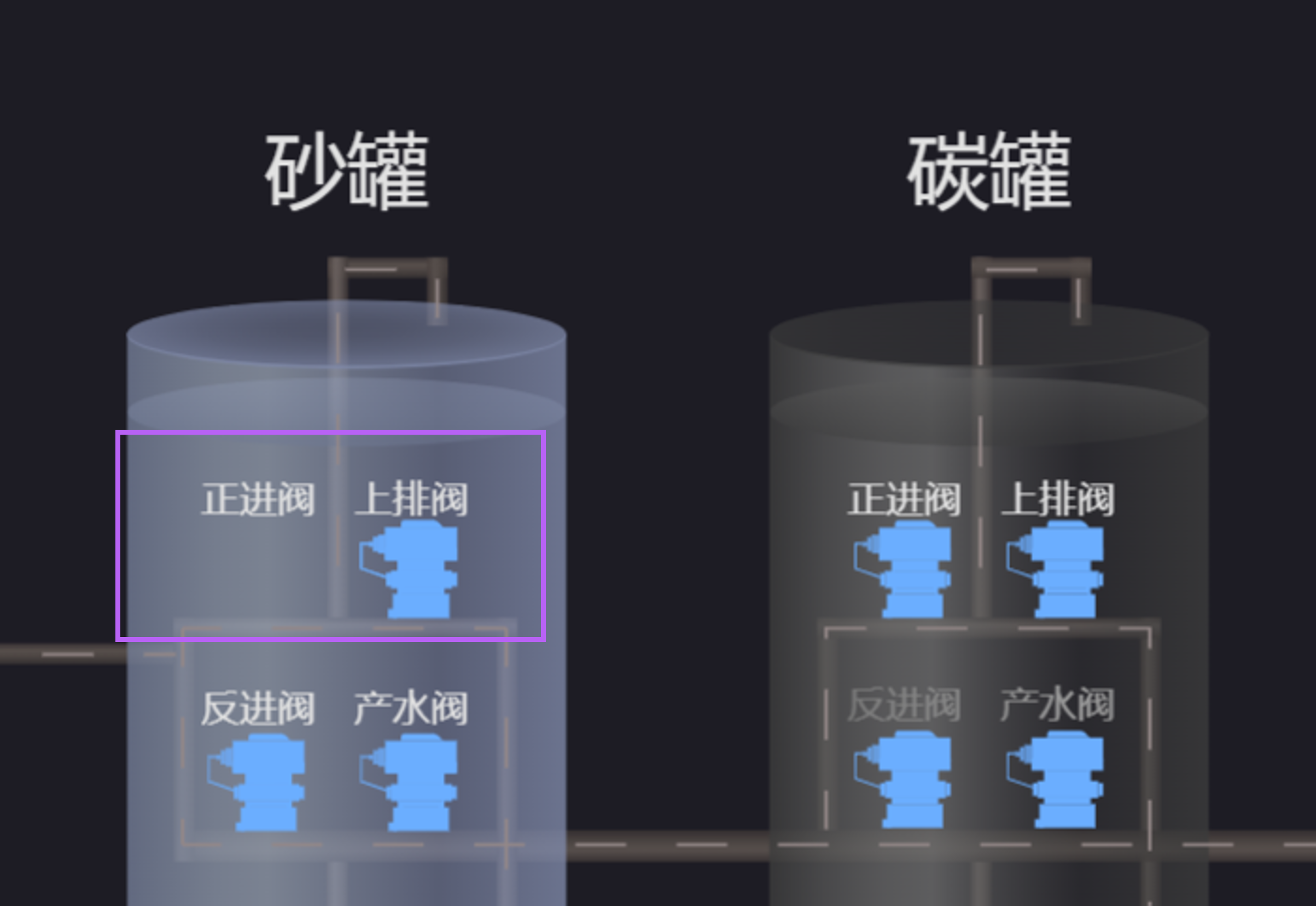 组态页面常用于构建设备运行状况的实时组态页面。本教程以纯水净化系统的智能监控为示例场景,实现氮封水箱液位、碳罐阀门开关状态及高压泵进水阀的交互跳转等设备数据的实时监控。