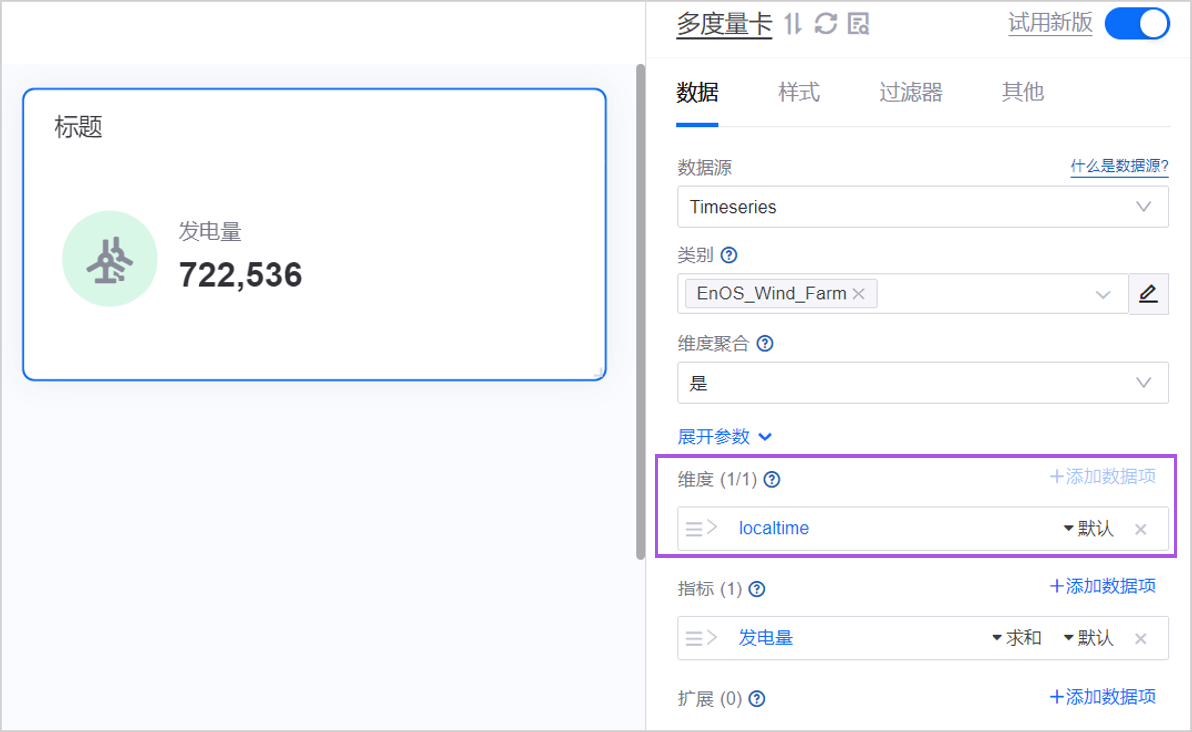 例如,在使用了 Timeseries 数据源的多指标卡中,可按照以下步骤,为指标“发电量”添加维度 localtime,并按当地时间聚合展示发电量数据。